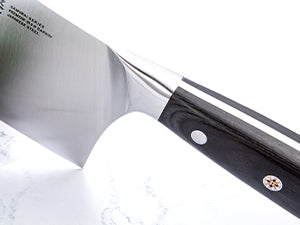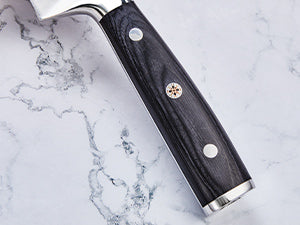 The meticulously constructed, triple-riveted Pakkawood handle has gone through special treatment, making this Japanese cleaver knife extremely impervious to heat, cold, and moisture; accented with a mosaic pin.