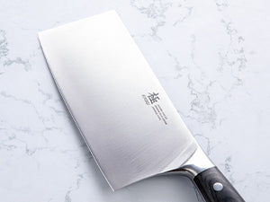 The Japanese cleaver knife's ruthlessly sharp edge is handcrafted by seasoned artisans to a mirror polish at 26-30° per side using the traditional 3-step Honbazuke method; cryogenically treated for incredible hardness, flexibility, and corrosion resistance.