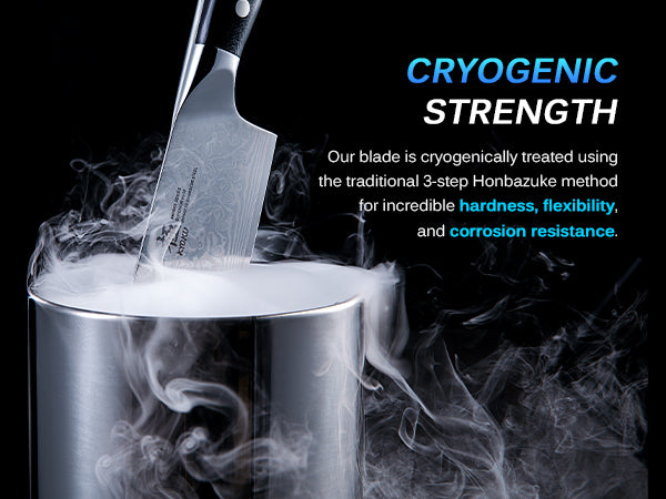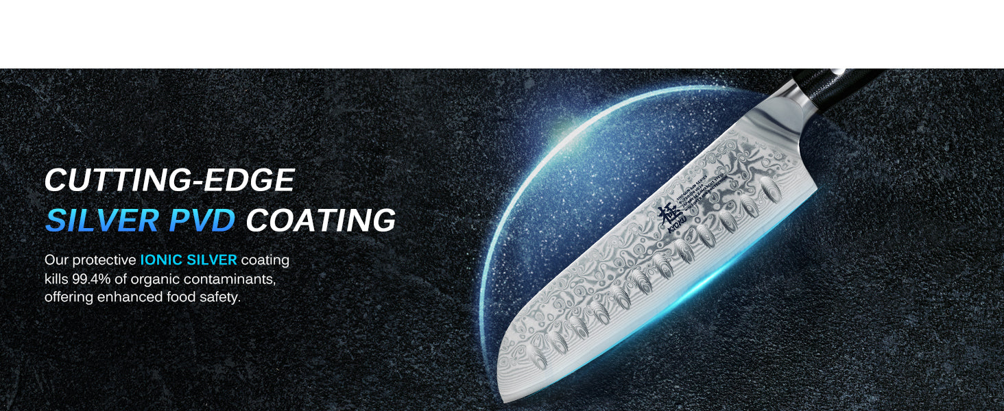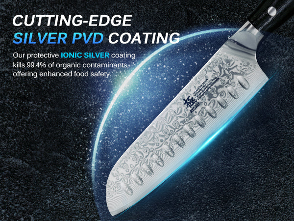 This santoku knife is a perfect fusion of tradition and technology, featuring cryogenically treated Japanese VG-10 steel and an innovative ionic silver coating for unrivaled hygienic performance.