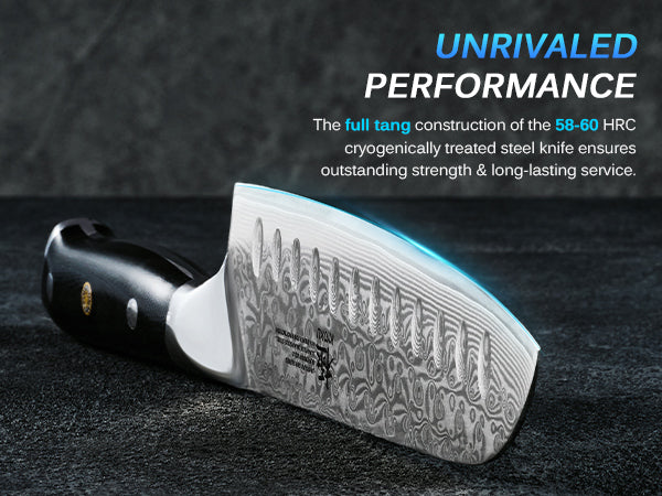 Manufactured with ultra-premium 67-layered stainless Damascus steel at HRC 58-60 hardness. The cobalt added steel outperforms AUS-10 steel in durability and is easier to sharpen, since cobalt enhances the other alloying elements.