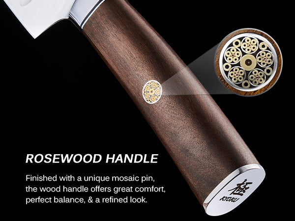 The durable rosewood handle is impervious to heat, cold, dust, and moisture while also boasting great comfort and perfect balance, preventing fatigue and cramp even when handling reunions, housewarmings, showers, and more. No detail is amiss, with a touch of elegance from the unique mosaic pin in the center of the handle. This beautiful piece of kitchen equipment comes complete with its own sheath and case to preserve and store it with care.