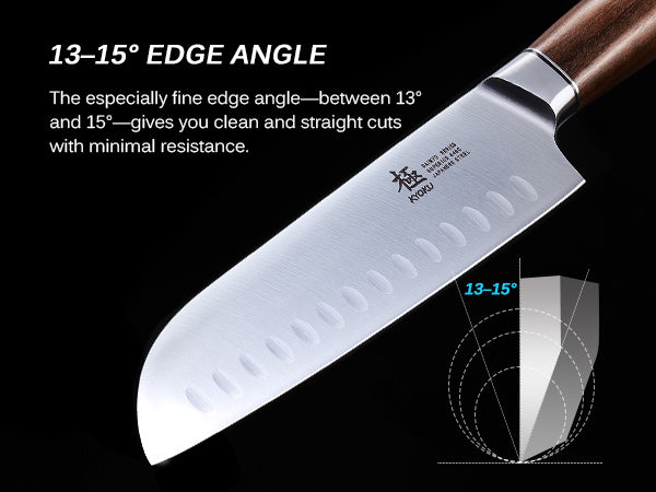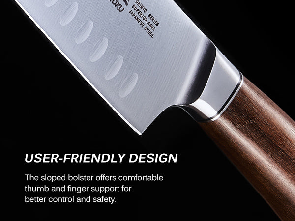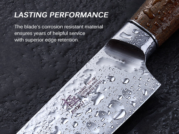 A perfect fusion of tradition and technology, this 7-inch Santoku knife is manufactured with vacuum-heated Japanese stainless steel to ensure outstanding durability. Thanks to its scalpel-like 13–15 degree edge, it combines the best features of a chef’s knife and a cleaver to slice with minimal resistance, making it perfect for cutting meat, fish, vegetables, and more with meticulously exact precision. The 440C steel’s 59-60 Rockwell hardness provides unrivaled performance, superior corrosion resistance, and exceptional edge retention.