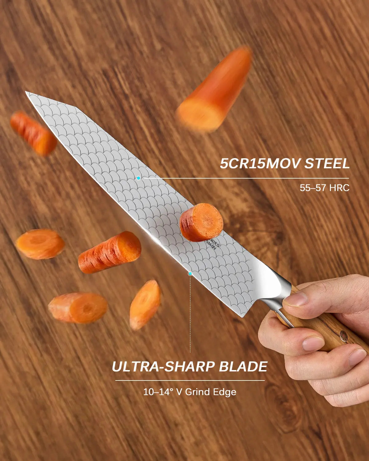 - Ultra-Sharp Blade: This kitchen knife's razor-sharp V-grind edge is precisely honed to 10-14 degrees for consistent sharpness. Its 5Cr15MoV steel blade, hardened to 55-57 HRC, is corrosion-resistant and withstands the nonstop action of busy kitchens