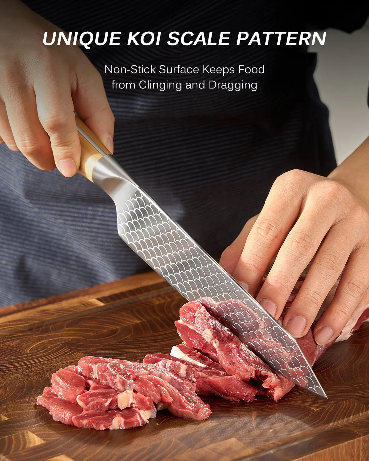 - Koi-Scale Surface Treatment: Inspired by koi scales, Kyoku's 8.5 in. Kiritsuke knife from the Koi series lets food glide off the blade effortlessly while bringing a touch of meaning and good luck to every cut