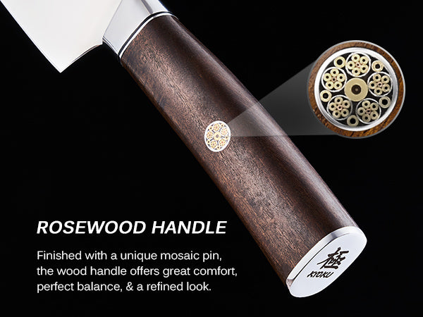 - The carefully constructed rosewood handle with its signature mosaic pin withstands cold, heat, corrosion, and moisture; the provided sheath and case allow you to preserve and store your knife with the cleanliness and care it deserves