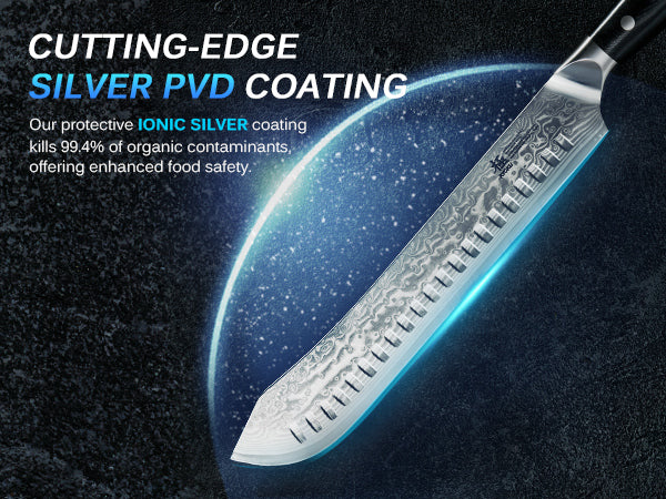 The knife is made with Japanese VG-10 steel and coated with ionic silver. It also has a full tang construction and a blade made of 58-60 HRC Damascus steel.