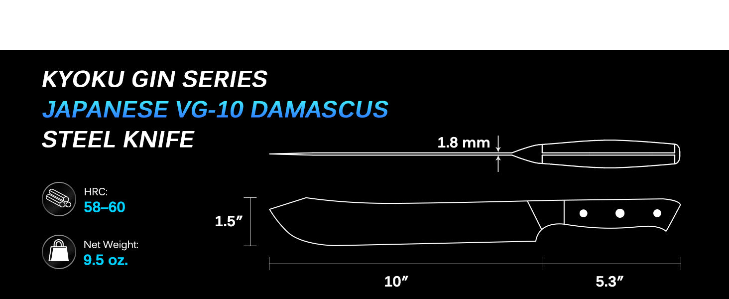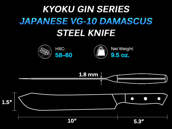 Take your culinary and kitchen experience to the next level with this 10″ bullnose butcher knife from Kyoku’s new Gin series! A perfect fusion of tradition and technology, this 10-inch multipurpose bullnose knife is manufactured with cryogenically treated Japanese VG-10 steel to ensure outstanding durability and is innovatively coated with ionic silver for unrivaled hygienic performance.