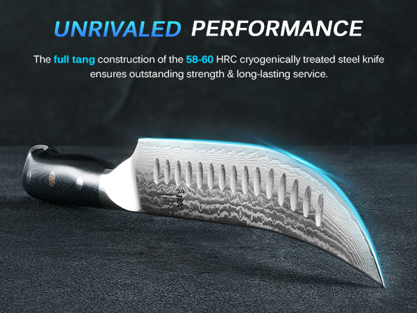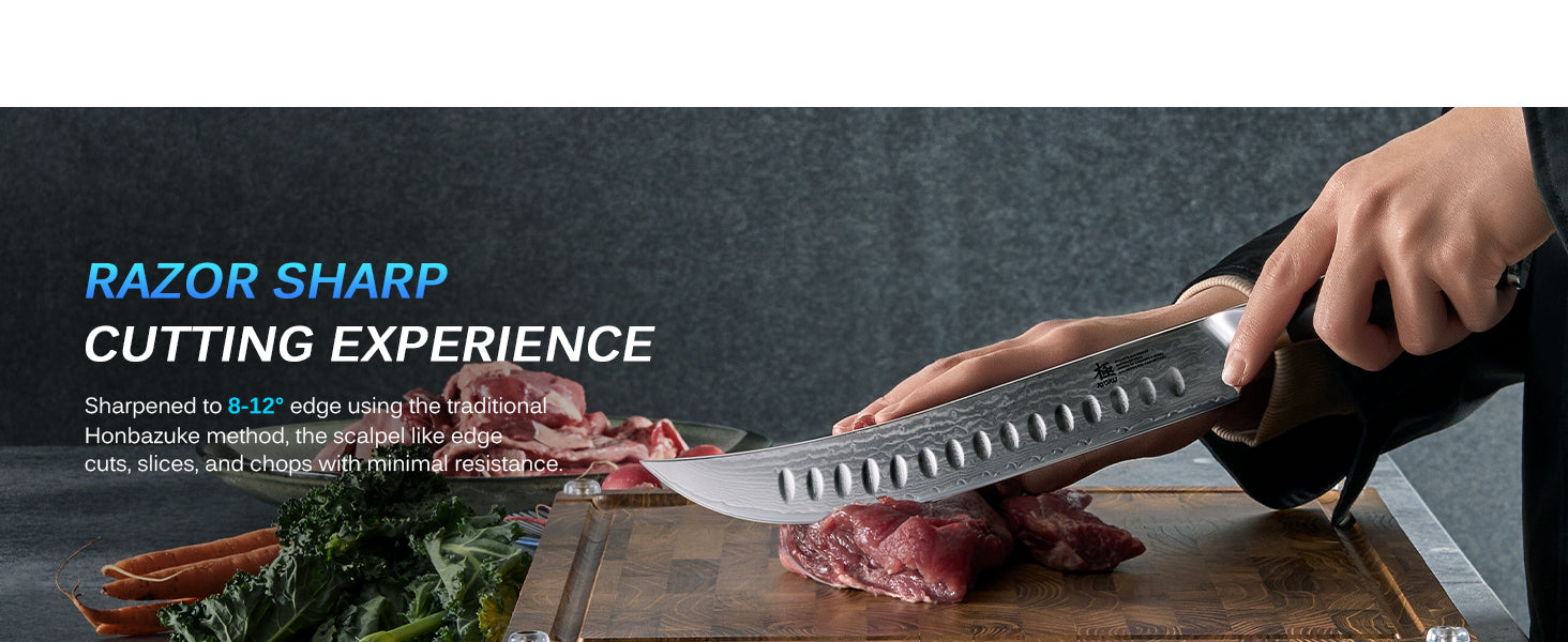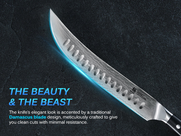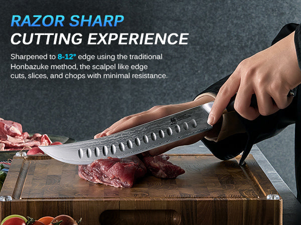 • Razor Sharp Blade: This butcher knife's ultra-sharp blade is precisely honed to 8-12 degrees, making it perfect for slicing hams, roasts, and poultries, while the dimples prevent food from sticking.