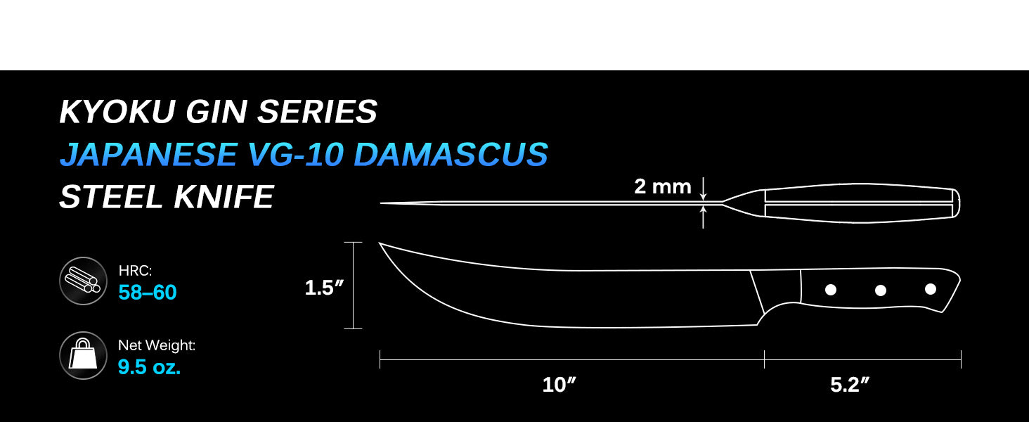 • 10" Cimitar Knife: Kyoku's 10" Scimitar knife from Gin series is expertly crafted with Japanese VG-10 stainless steel for superior performance and durability. With its curved & sharp blade, this knife is ideal for slicing and portioning large cuts of meat.