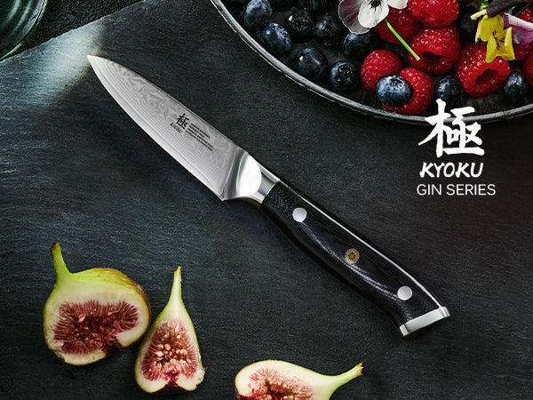 Take your culinary and kitchen experience to the next level with this paring knife from Kyoku’s new Shogun Gin series! A perfect fusion of tradition and technology, this 3.5 inch fruit knife is manufactured with cryogenically treated Japanese VG-10 steel to ensure outstanding durability, and innovatively coated with ionic silver for unrivaled hygienic performance. Thanks to its scalpel like edge, it slices with minimal resistance, making it perfect for peeling, mincing, coring fruit and vegetables, deveining shrimp, and more with meticulously exact precision.
