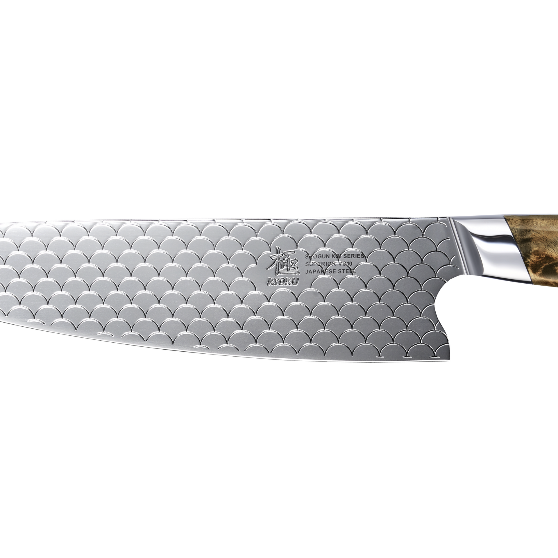 Inspired by the structure of fish scales, Kyoku’s KOI Series features a meticulously applied chemical etching technique that creates uniform scale-like grooves across the blade surface. This controlled process ensures precise depth without compromising the steel’s integrity. The textured surface significantly reduces food sticking, while also enhancing wear and corrosion resistance.