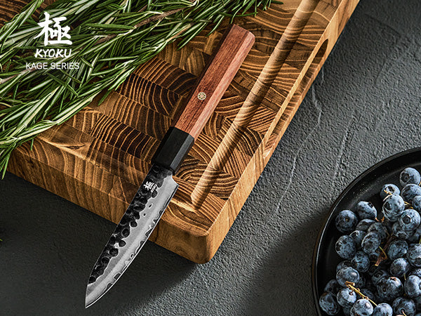 Need precision cutting for your meals? Kyoku's utility knife, with its 4.5" blade and 13-15 degree razor-sharp edge, is perfect for tasks that are too small for a chef's knife but too large for a paring knife. Whether you're mincing shallots, cutting herbs, slicing cheese, or trimming meat, this knife can handle it all. The comfortable rosewood handle and agile 3-layer laminated steel blade make sure each cut is effortless and smooth, significantly reducing your meal prep time. Packaged in an elegant gift box, this knife also makes a thoughtful present for any chef or cooking enthusiast. Say goodbye to dull kitchen knives and transform your daily meal prep experience with Kyoku's 4.5" utility knife!
