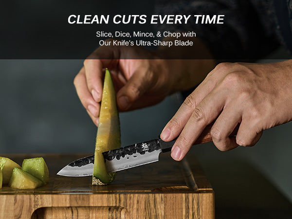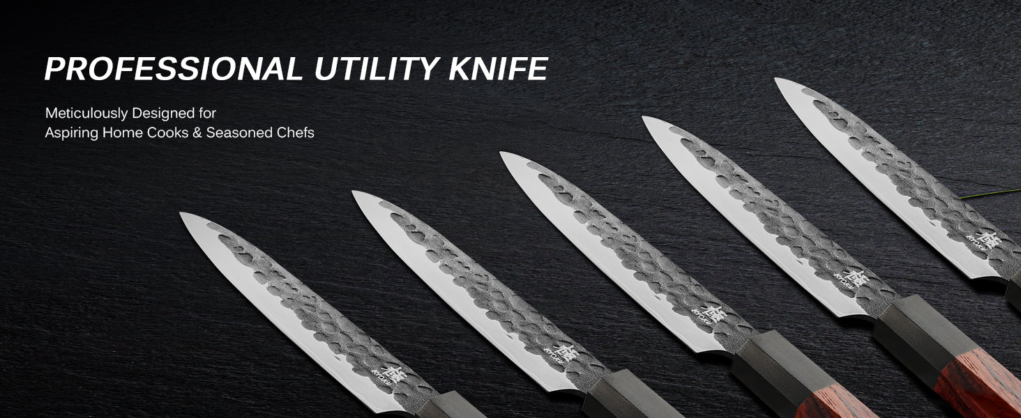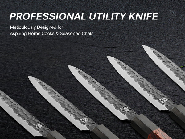 - Versatile Use: With a 0.08" thick blade honed to a precise 13-15° edge, our utility kitchen knife glides through vegetables, fruits, and meats with minimal resistance. Ideal for tasks that are too small for a chef's knife but too large for a paring knife