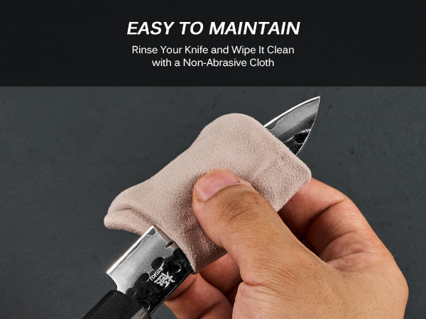 Treat your knife with care! Hand wash it with mild soap, dry it immediately, and store it in a knife block or on a magnetic strip. Sharpen it regularly to keep it in top shape and avoid using it on hard surfaces.