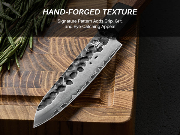 - Meticulous Craftsmanship: The hammered patterns on the blade not only give this kitchen knife a unique aesthetic but also help reduce food sticking. The mosaic pin on the handle adds a distinctive touch, enhancing this knife's overall design and appeal