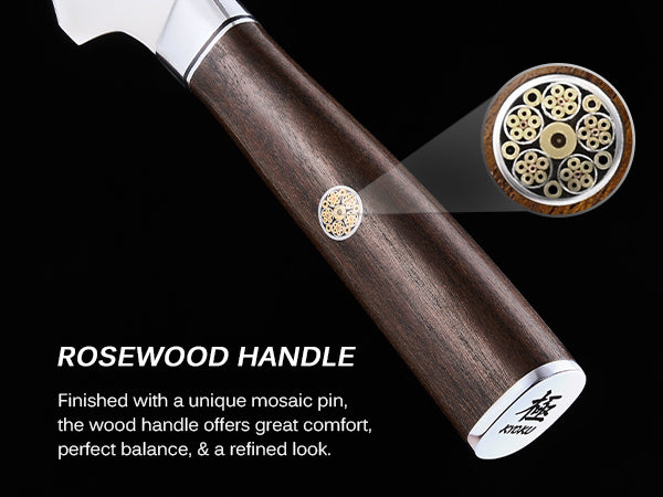 Engineered for professional results, the Kyoku Daimyo 6.5" Boning Knife features vacuum heat-treated Japanese 440C stainless steel (59-60 HRC) with a razor-sharp 13-15° edge, delivering effortless precision for deboning, filleting, and trimming meats. The rosewood handle with mosaic pin ensures perfect balance and control, while the included sheath protects your investment.