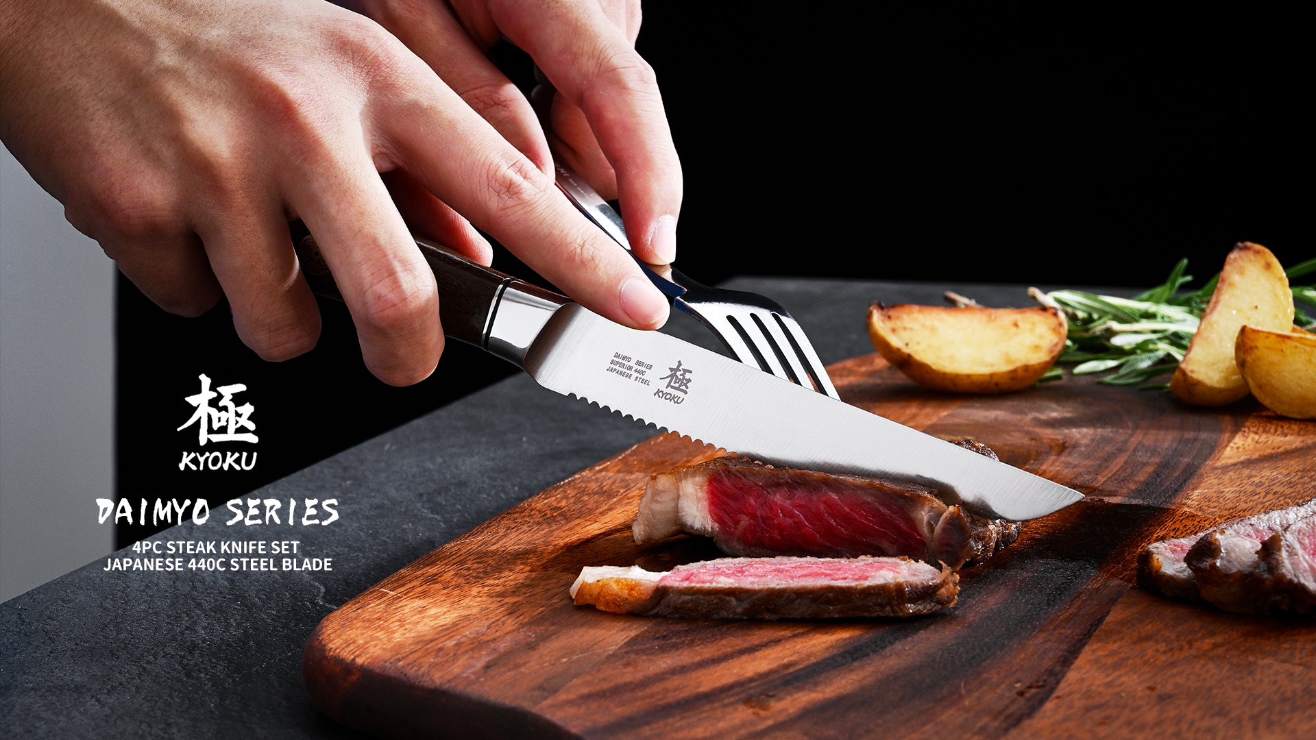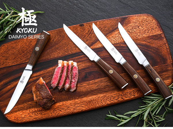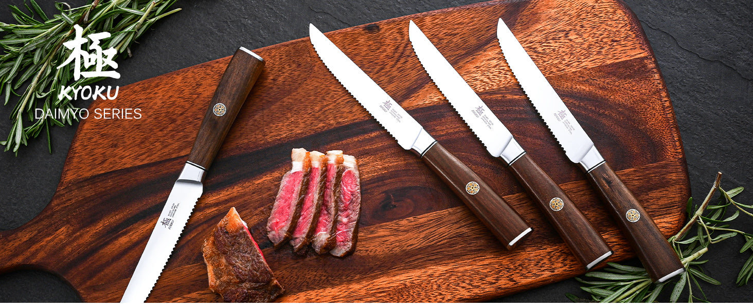 • This 4 piece steak knife set is part of Kyoku's premier Daimyo series, manufactured with modern technology and traditional care and craftsmanship; its Japanese 440C stainless steel has been vacuum heat treated and paired with perfectly balanced rosewood handles to offer superior precision and control to chefs and diners alike