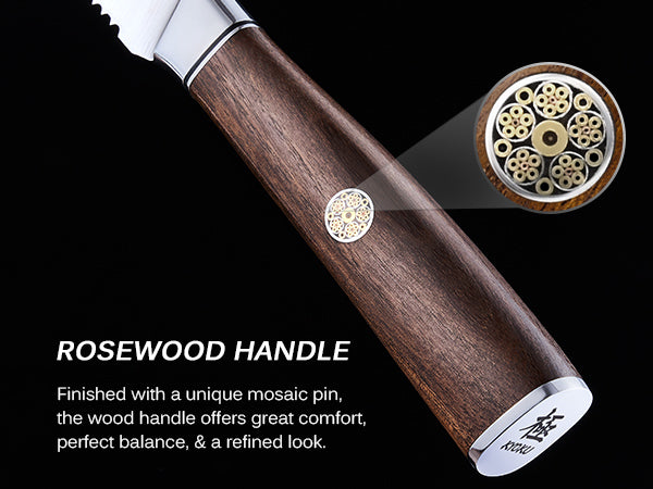 • The carefully constructed rosewood handle with its signature mosaic pin withstands cold, heat, corrosion, and moisture; the provided sheath and case allow you to preserve and store your knife with the cleanliness and care it deserves