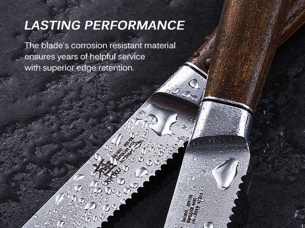 A perfect fusion of tradition and technology, this 4 piece steak knife set is manufactured with vacuum heat-treated Japanese stainless steel to ensure outstanding durability. Thanks to their scalpel-like 13-15 degree edges, they slice with minimal resistance, making them perfect for cutting any meaty dish with meticulously exact precision, from large juicy steaks to tender chicken breast. This table knife set's 440C steel’s 59-60 Rockwell hardness provides unrivaled performance, superior corrosion resistance, and exceptional edge retention. The durable rosewood handles are impervious to heat, cold, rust, and moisture while also boasting great comfort and perfect balance, preventing fatigue and cramp even while slicing through the thickest cuts of rib-eye steak. No detail is amiss, with a touch of elegance from the unique mosaic pins in the center of the handles. These graceful pieces of kitchen equipment look beautiful on any dinner table and in any kitchen decor. Our kitchen knives come complete with their own sheathes and a case to preserve and store them with care.